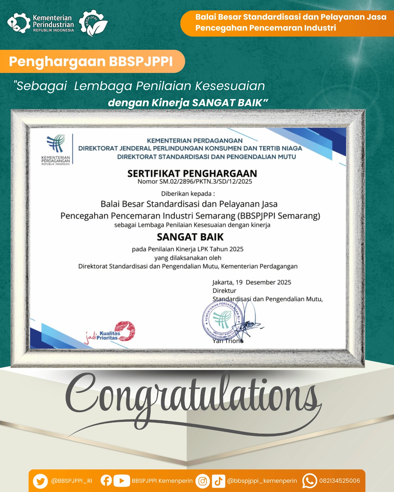 SEMARANG – Balai Besar Standardisasi dan Pelayanan Jasa Pencegahan Pencemaran Industri (BBSPJPPI) kembali menorehkan prestasi gemilang di penghujung tahun 2025. Berdasarkan hasil evaluasi terkini, BBSPJPPI sukses meraih penghargaan sebagai Lembaga Penilaian Kesesuaian (LPK) dengan kinerja "SANGAT BAIK".