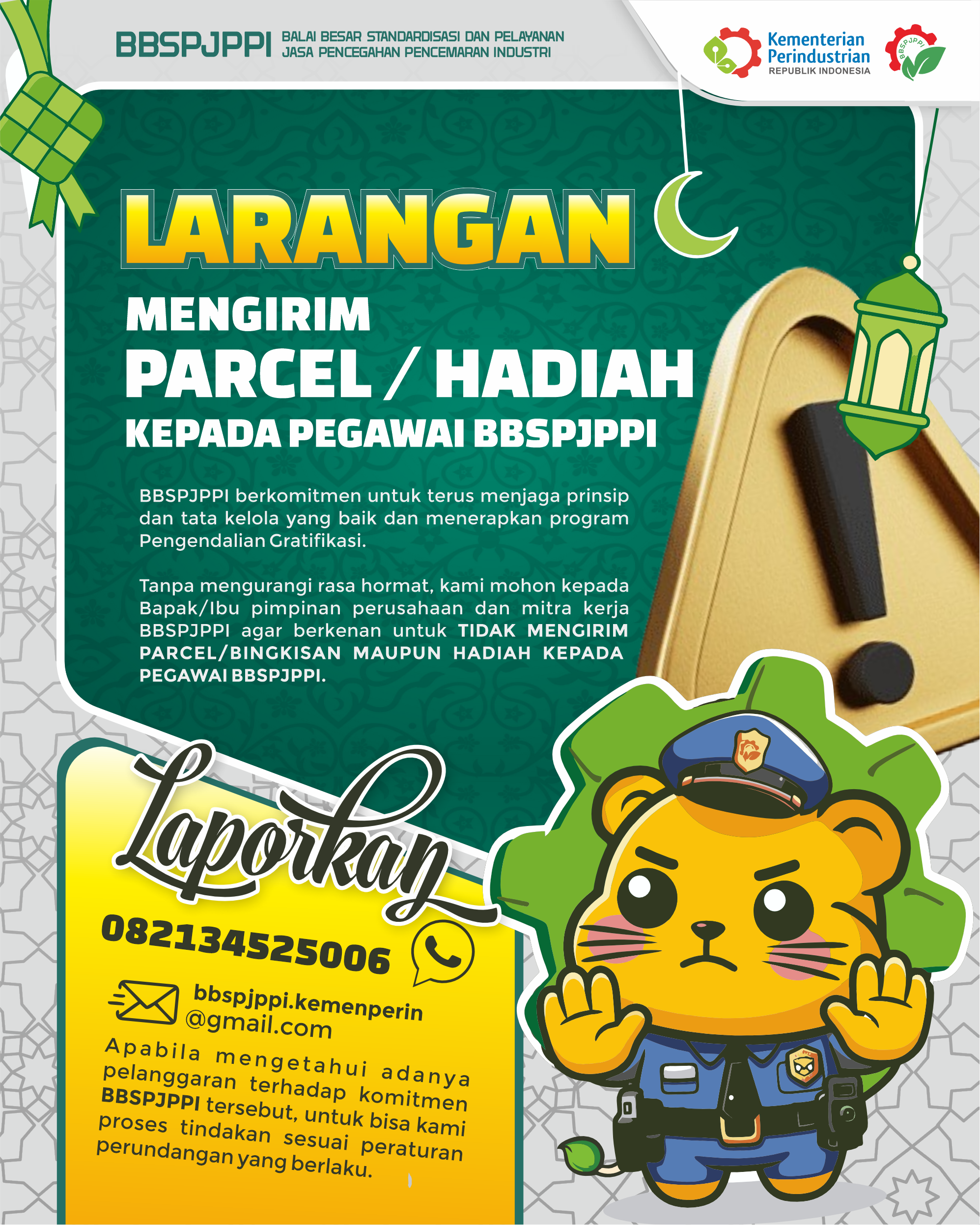 Tanpa mengurangi rasa hormat, kami mohon kepada Bapak/Ibu pimpinan perusahaan dan mitra kerja BBSPJPPI agar berkenan untuk TIDAK MENGIRIM PARCEL/BINGKISAN MAUPUN HADIAH KEPADA PEGAWAI BBSPJPPI, baik pada Hari Raya Keagamaan maupun pada hari-hari lainnya.