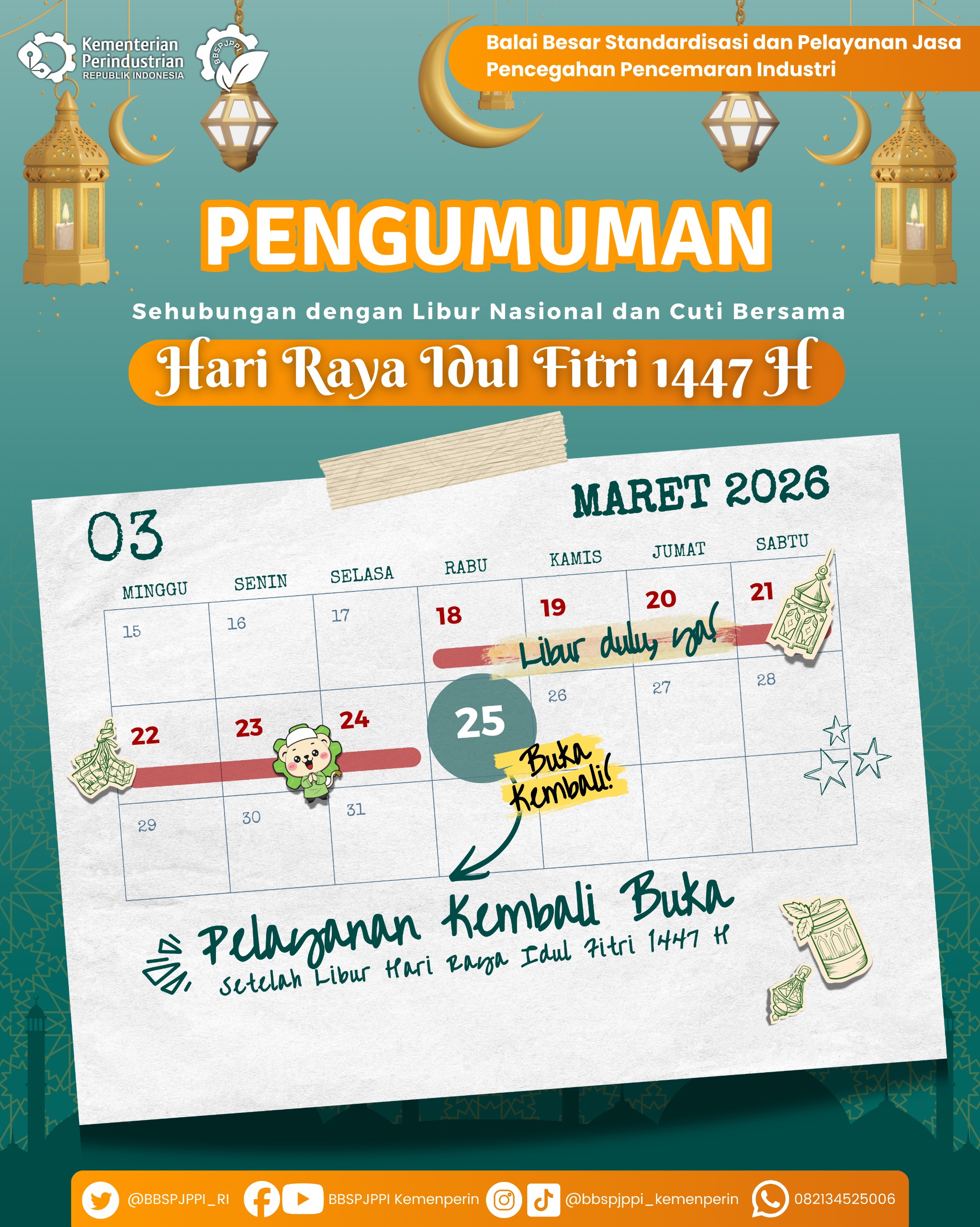 Sehubungan dengan Libur Nasional dan Cuti Bersama Hari Raya Idul Fitri 1447 H, kami informasikan bahwa: