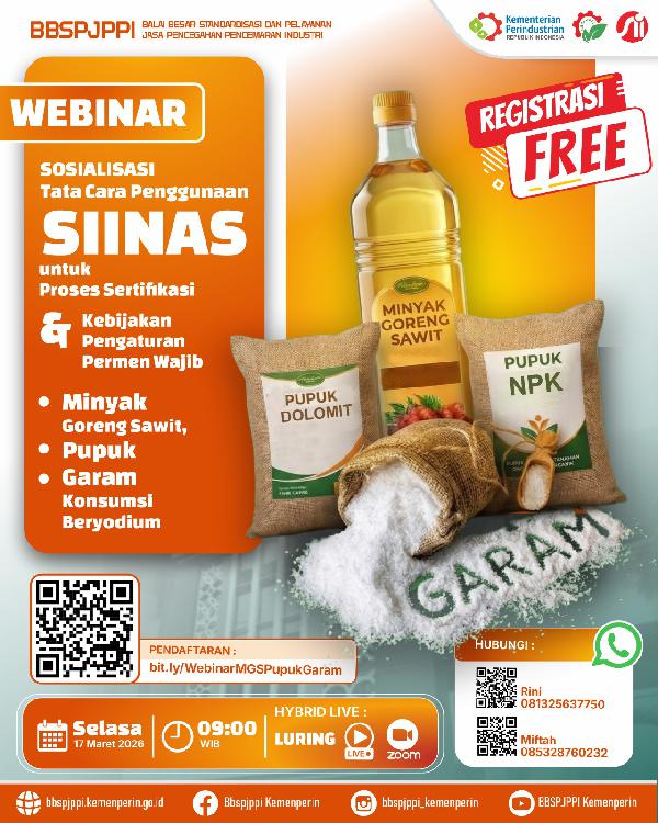 Webinar:“Sosialisasi Tata Cara Penggunaan SIINAS untuk Proses Sertifikasi & Kebijakan Pengaturan Permen Wajib : Minyak Goreng Sawit, Pupuk, Garam Konsumsi Beryodium.”