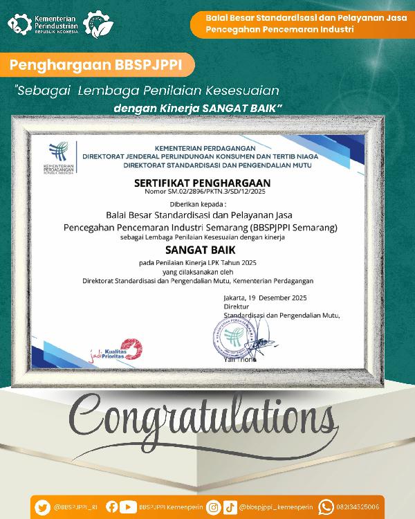 SEMARANG – Balai Besar Standardisasi dan Pelayanan Jasa Pencegahan Pencemaran Industri (BBSPJPPI) kembali menorehkan prestasi gemilang di penghujung tahun 2025. Berdasarkan hasil evaluasi terkini, BBSPJPPI sukses meraih penghargaan sebagai Lembaga Penilaian Kesesuaian (LPK) dengan kinerja ...